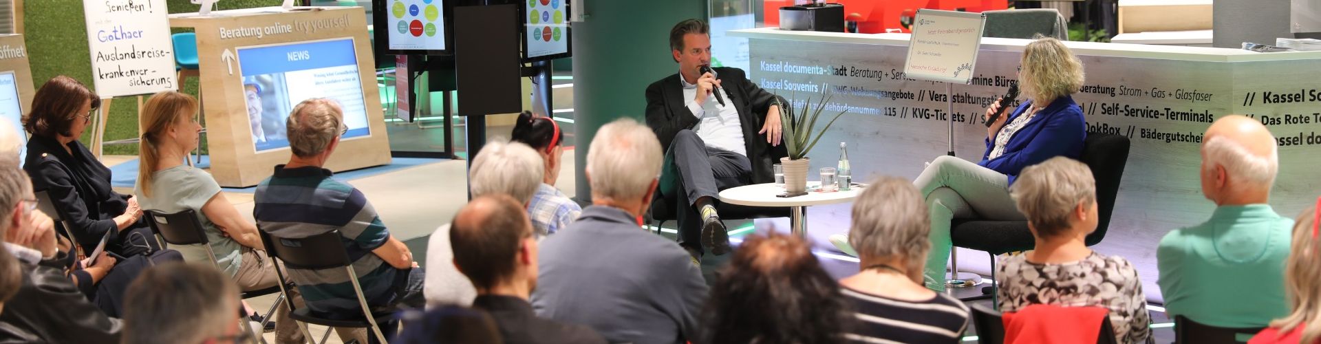 Wir reden über Werte und die Welt, Hoffnungen und Haltungen, Gott und Glück. Und das mitten im Kaufhaus GALERIA: in der Eventlounge am Kassel Service Point! Regelmäßig lade ich, Kerstin Leitschuh, Menschen aus Kultur, Politik und Gesellschaft zu den Feierabendgesprächen ein. Eine halbe Stunde lang tauchen wir ein in existentielle Fragen, die das Leben stellt: Persönlich - tiefgründig - kurzweilig. Die Veranstaltungsreihe findet in Kooperation mit Kassel Marketing statt.