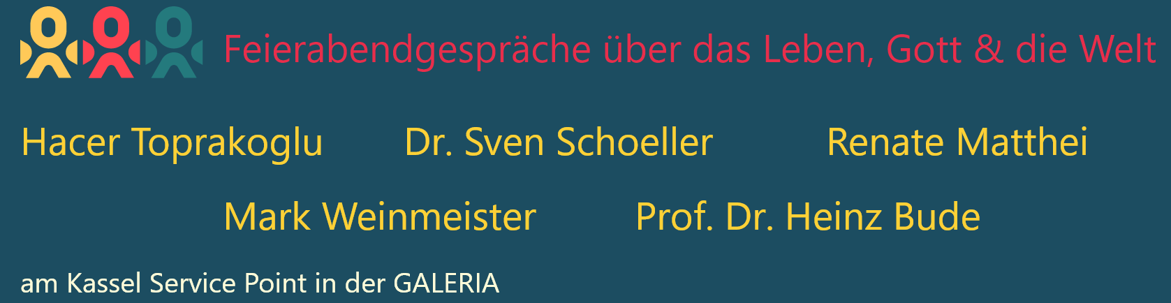 Wunderbare Gäste haben zur nächsten Runde der Feierabendgespräche zugesagt. Kerstin Leitschuh von der Citypastoral Kassel spricht mit ihnen über Werte und die Welt, Hoffnungen und Haltungen, Gott und Glück - das Leben eben. Das halbstündige Gespräch findet ab Mai am 1. und 3. Donnerstag im Monat um 17 Uhr am Kassel Service Point in der Galeria, Obere Königsstraße 31, Kassel, erster Stock, statt. Die Feiertage sind ausgenommen.